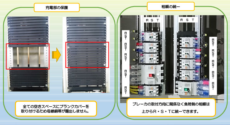 - 全ての空きスペースにブランクカバーを取り付けるため母線銅帯が露出しません。